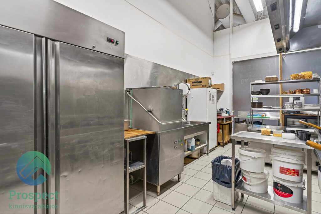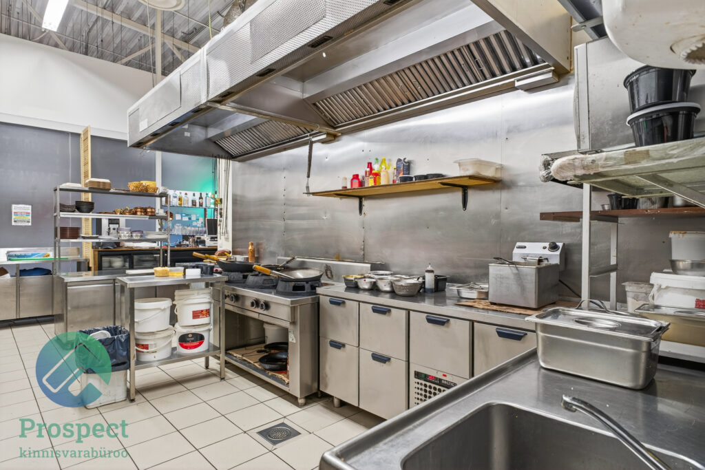 - Köök, täielikult varustatud kõigega: professionaalne ventilatsioon ja õhueraldaja (toas ei ole toidulõhna), pliit, külmikud, sügavkülmikud, nõudepesumasin, tandur, fritüür, kohvimasin, kassaseade ja muud, sh kogu kööginõud: kausid, tassid, klaasid, taldrikud;